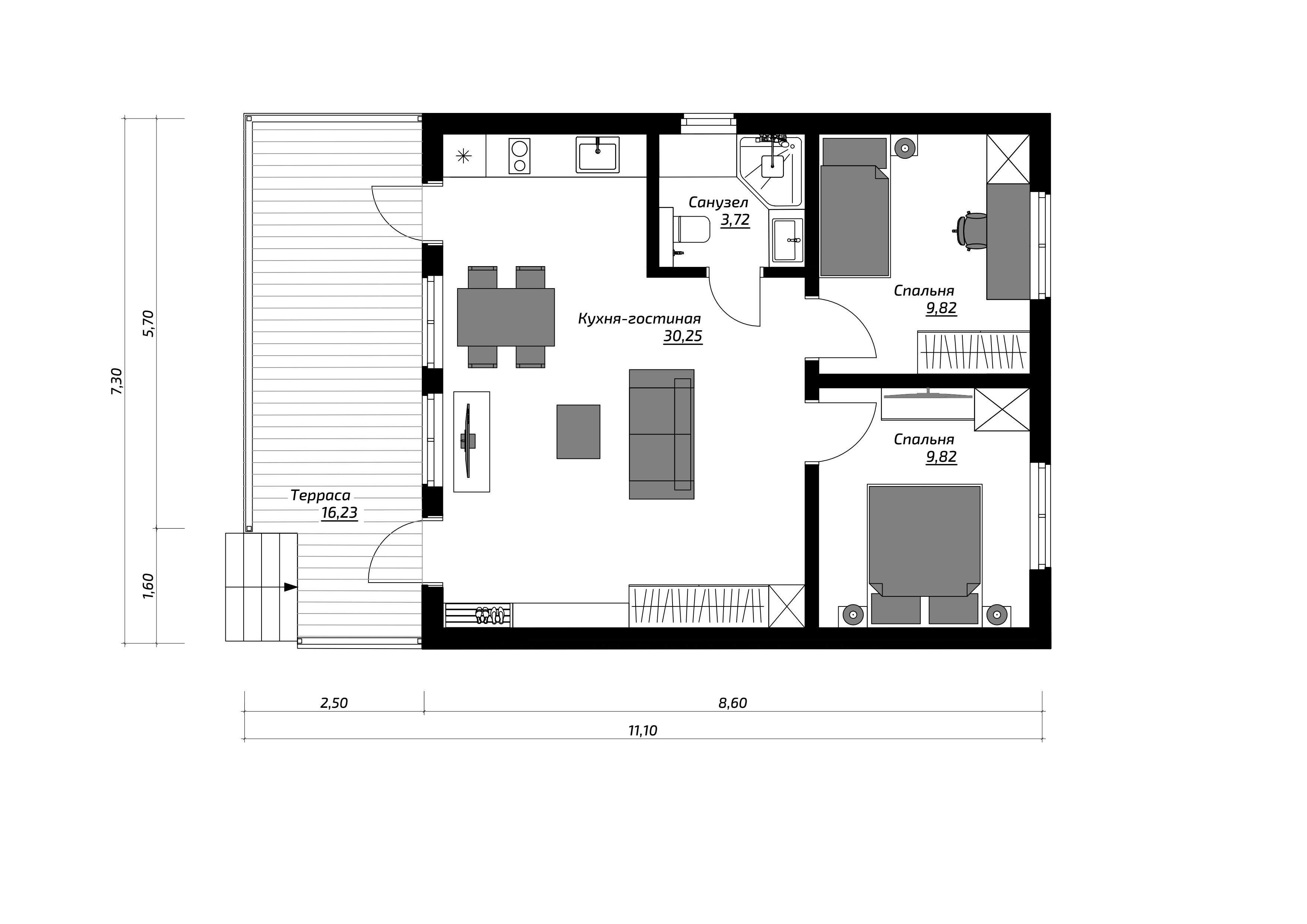 Проект МОЕН 54 – это одноэтажный дом с продуманной планировкой, идеально подходящий для небольшой семьи или пары. Две просторные спальни под двускатной крышей обеспечат каждому члену семьи личное пространство и комфортный отдых. Сердцем дома является просторная кухня-гостиная, где вы сможете собираться всей семьей за обедом или проводить время с друзьями.