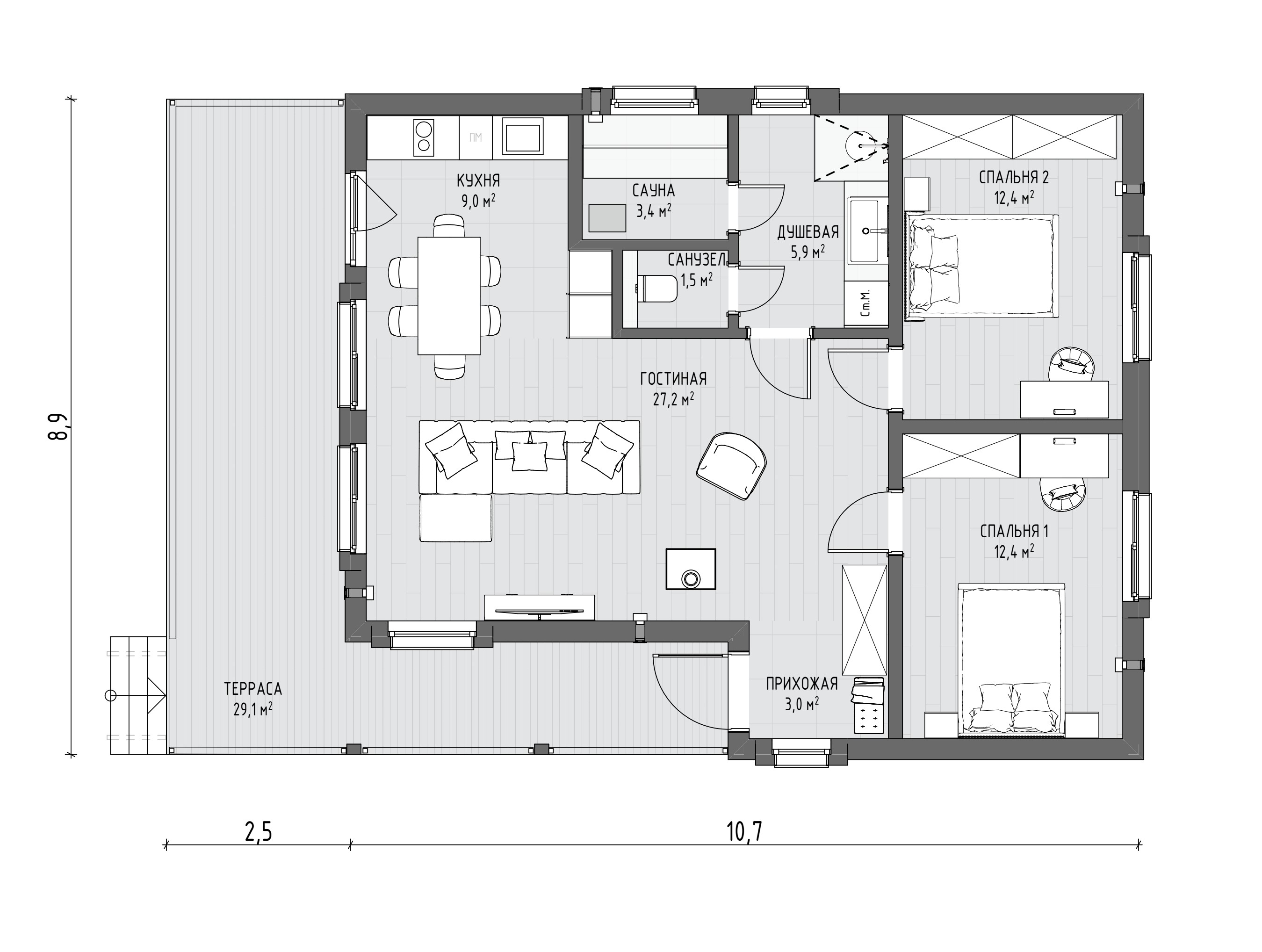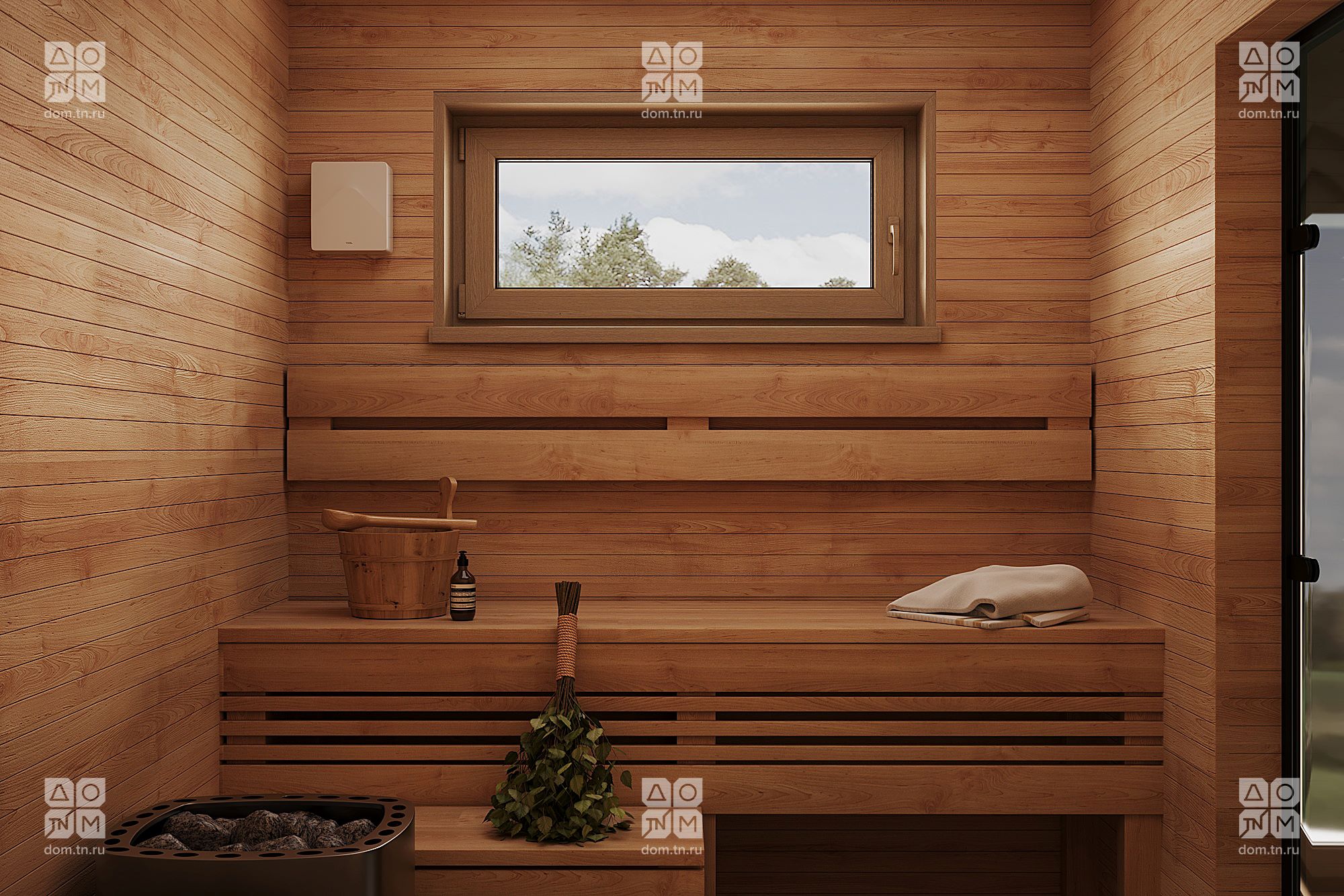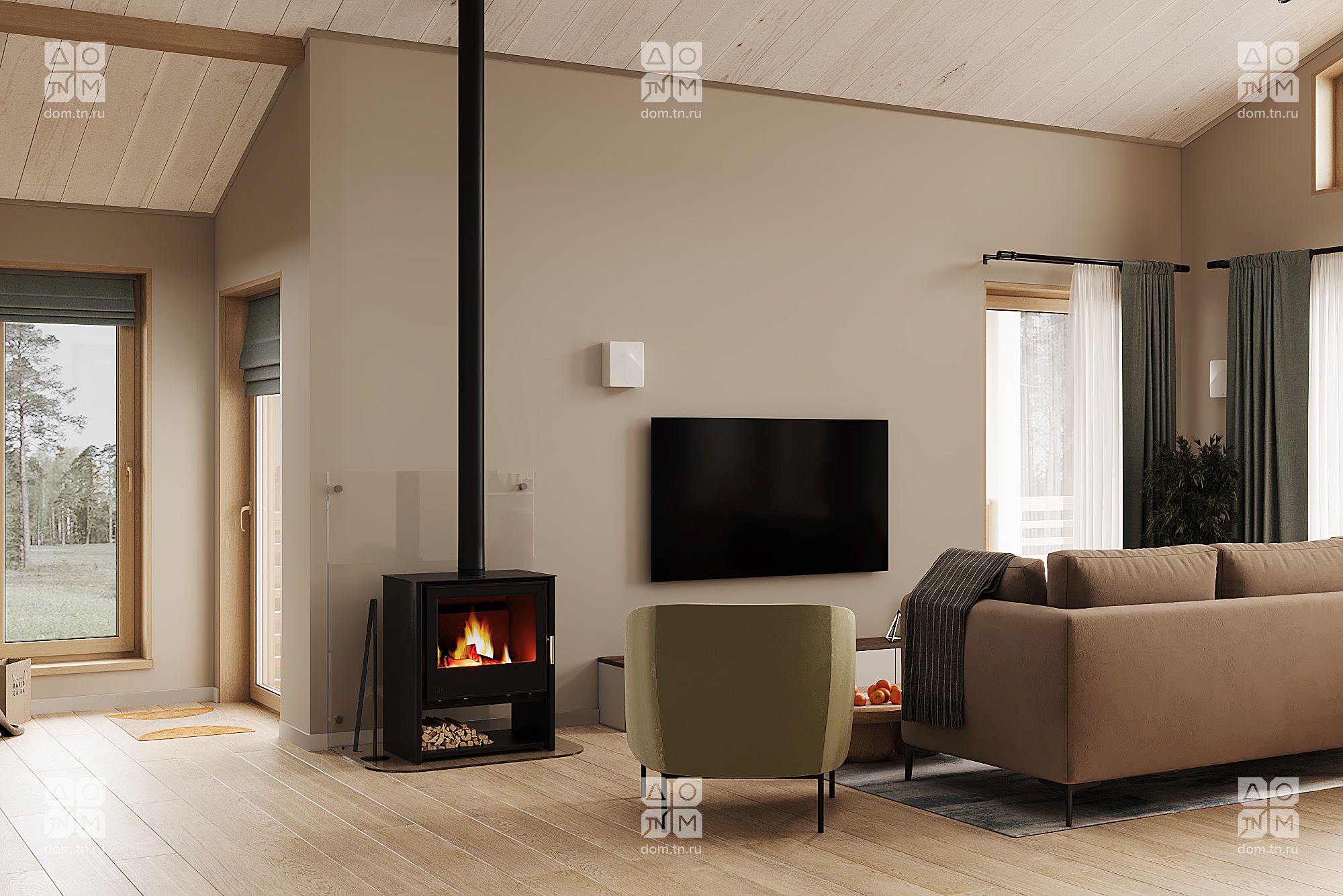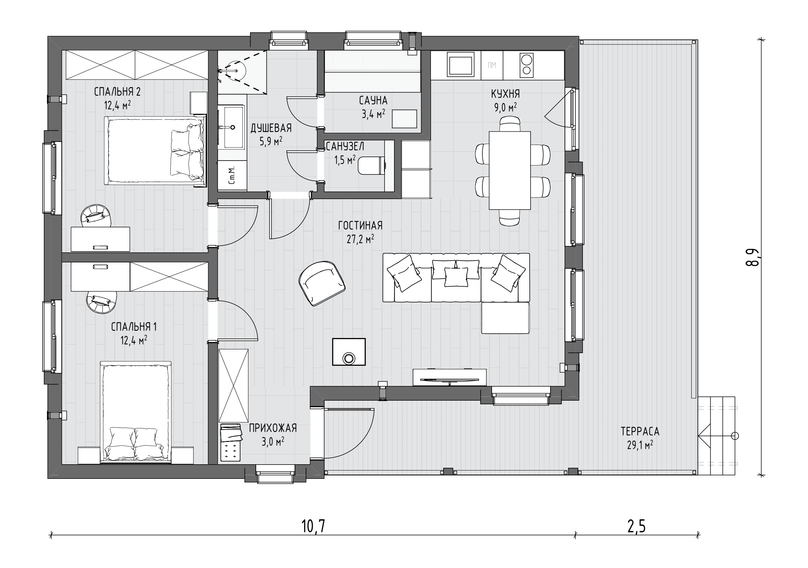 Популярность проекта МОНЕ среди заказчиков привела к его эволюции в МОНЕ 75. Полюбившиеся клиентам планировочные решения остались нетронутыми, изменились лишь размеры комнат. Под двухскатной кровлей расположены две спальни, объединенная кухня-гостиная, СПА-пространство, входная зона, а к главному фасаду прилегает открытая терраса без навеса, незащищенная с трех сторон. Площадь закрытых помещений была увеличена до 74,79 м², а ванная комната расширена до 10,77 м² и дополнена еще одним окном.