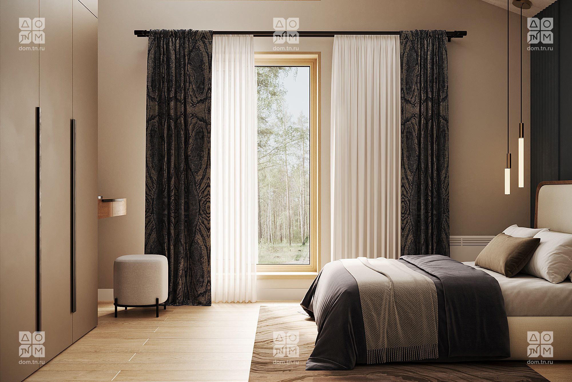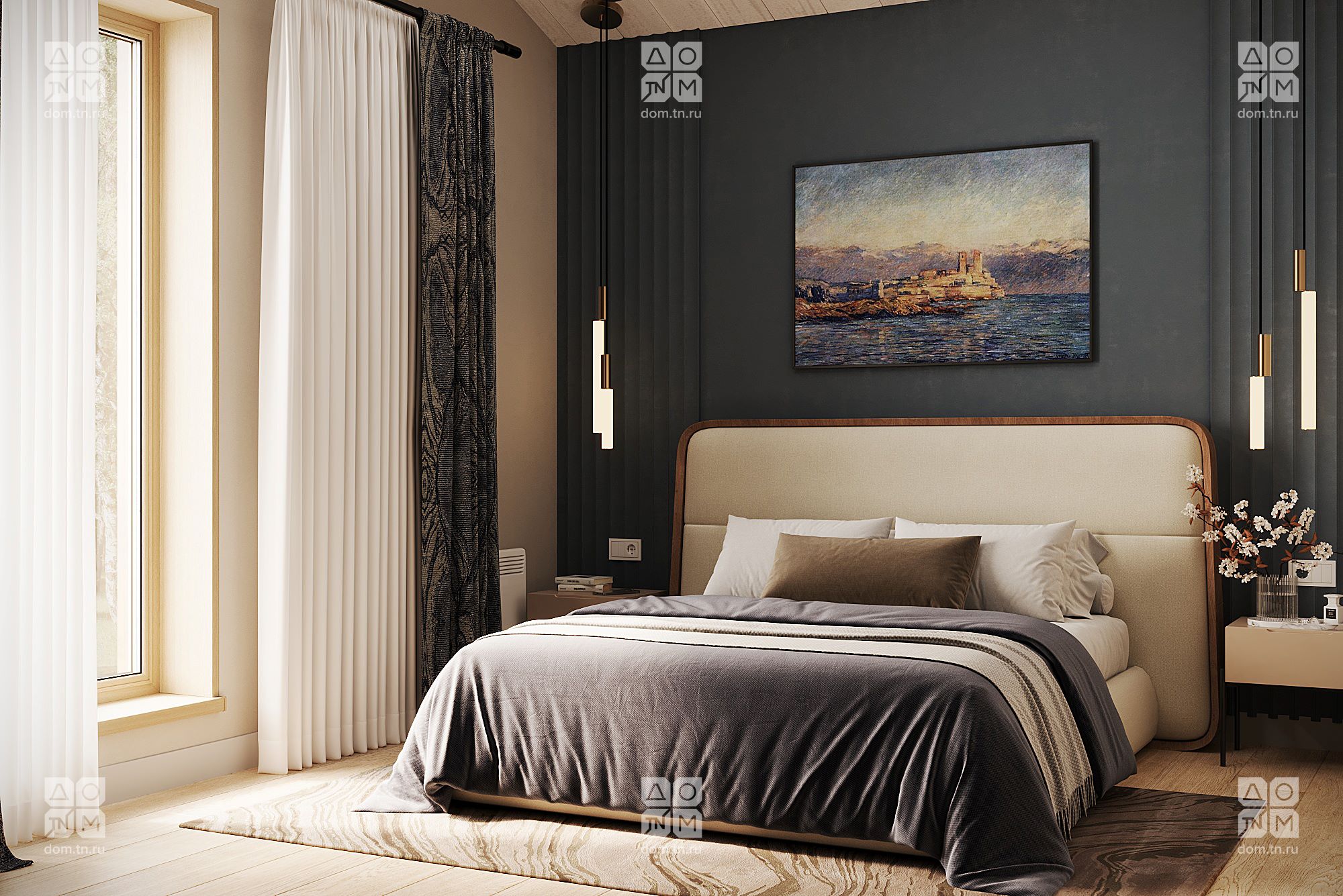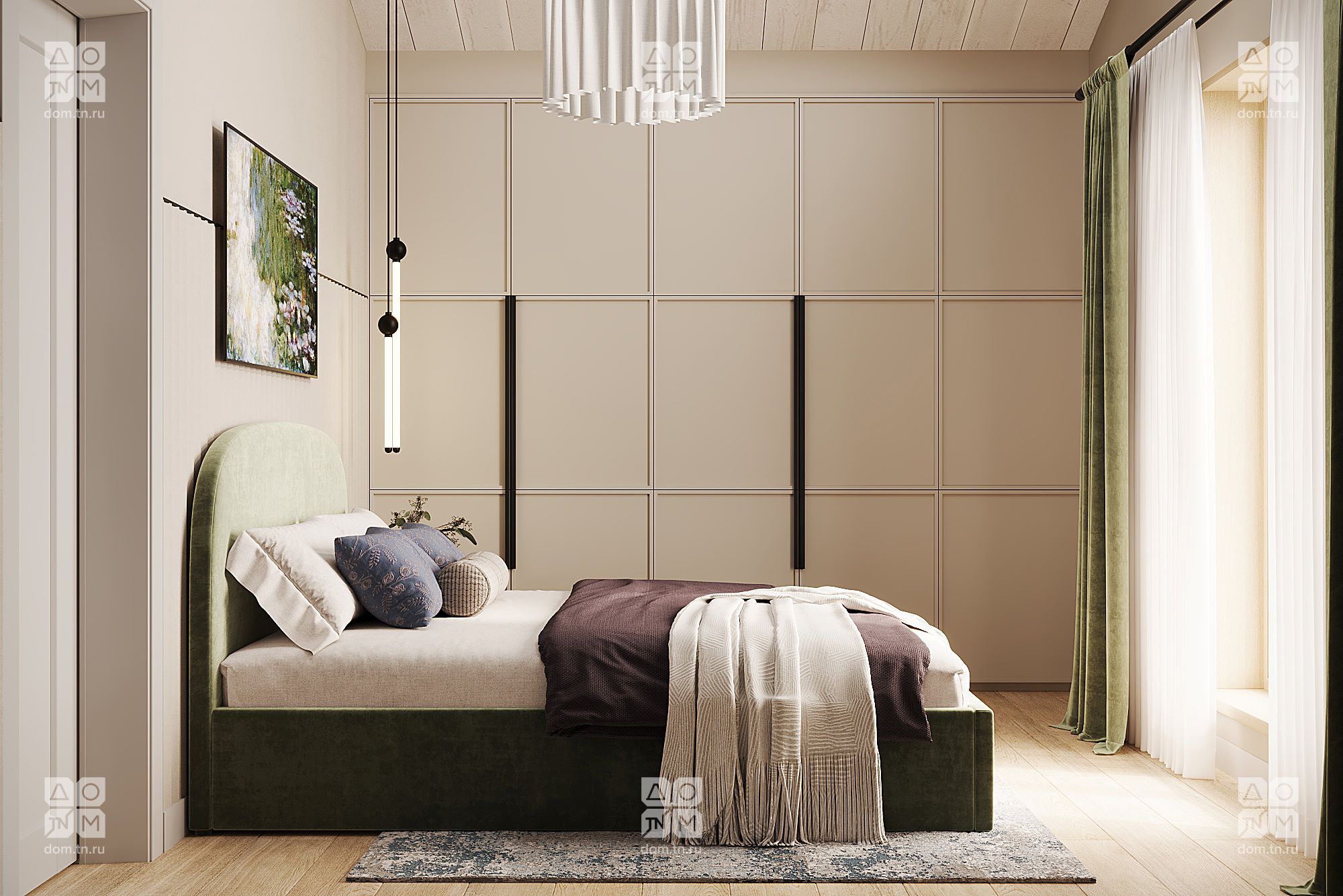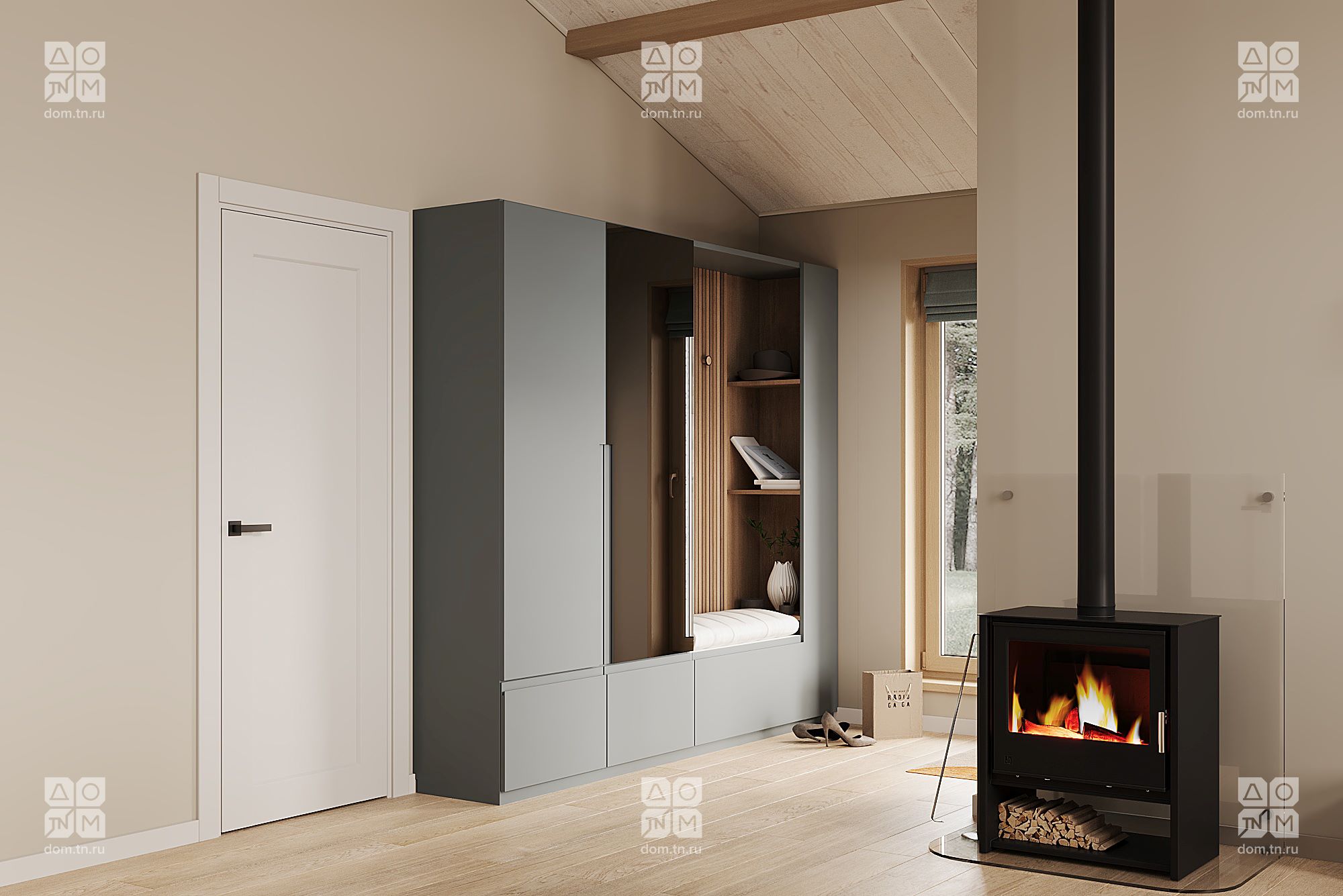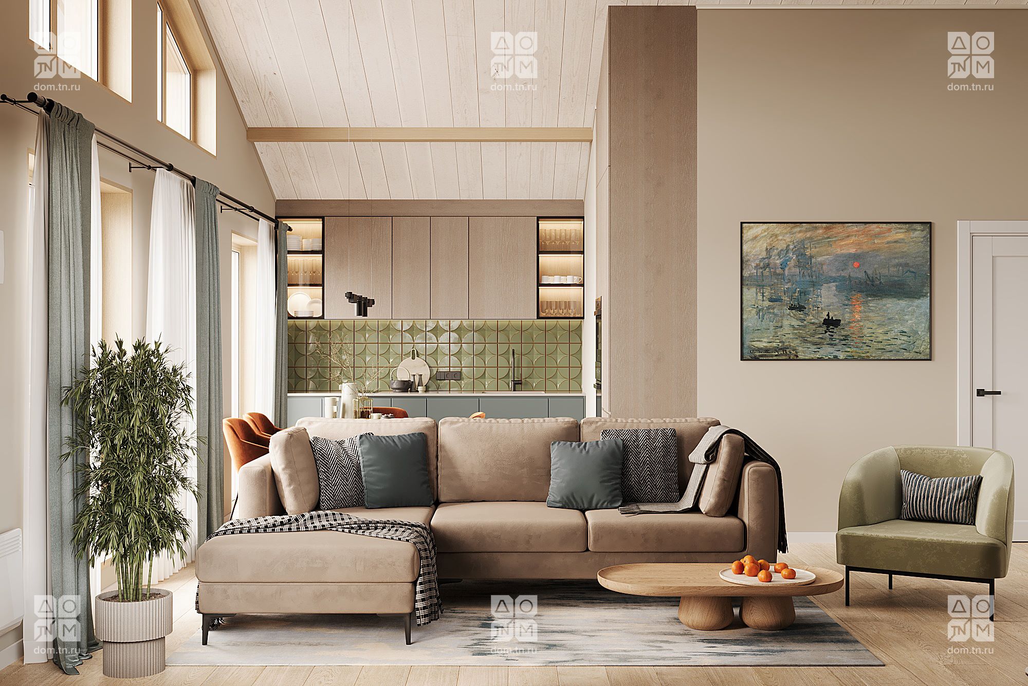 Популярность проекта МОНЕ среди заказчиков привела к его эволюции в МОНЕ 75. Полюбившиеся клиентам планировочные решения остались нетронутыми, изменились лишь размеры комнат. Под двухскатной кровлей расположены две спальни, объединенная кухня-гостиная, СПА-пространство, входная зона, а к главному фасаду прилегает открытая терраса без навеса, незащищенная с трех сторон. Площадь закрытых помещений была увеличена до 74,79 м², а ванная комната расширена до 10,77 м² и дополнена еще одним окном.