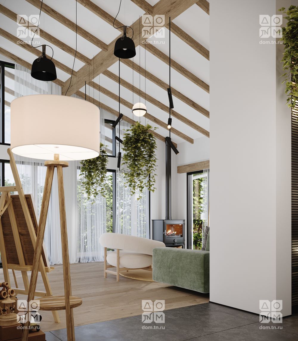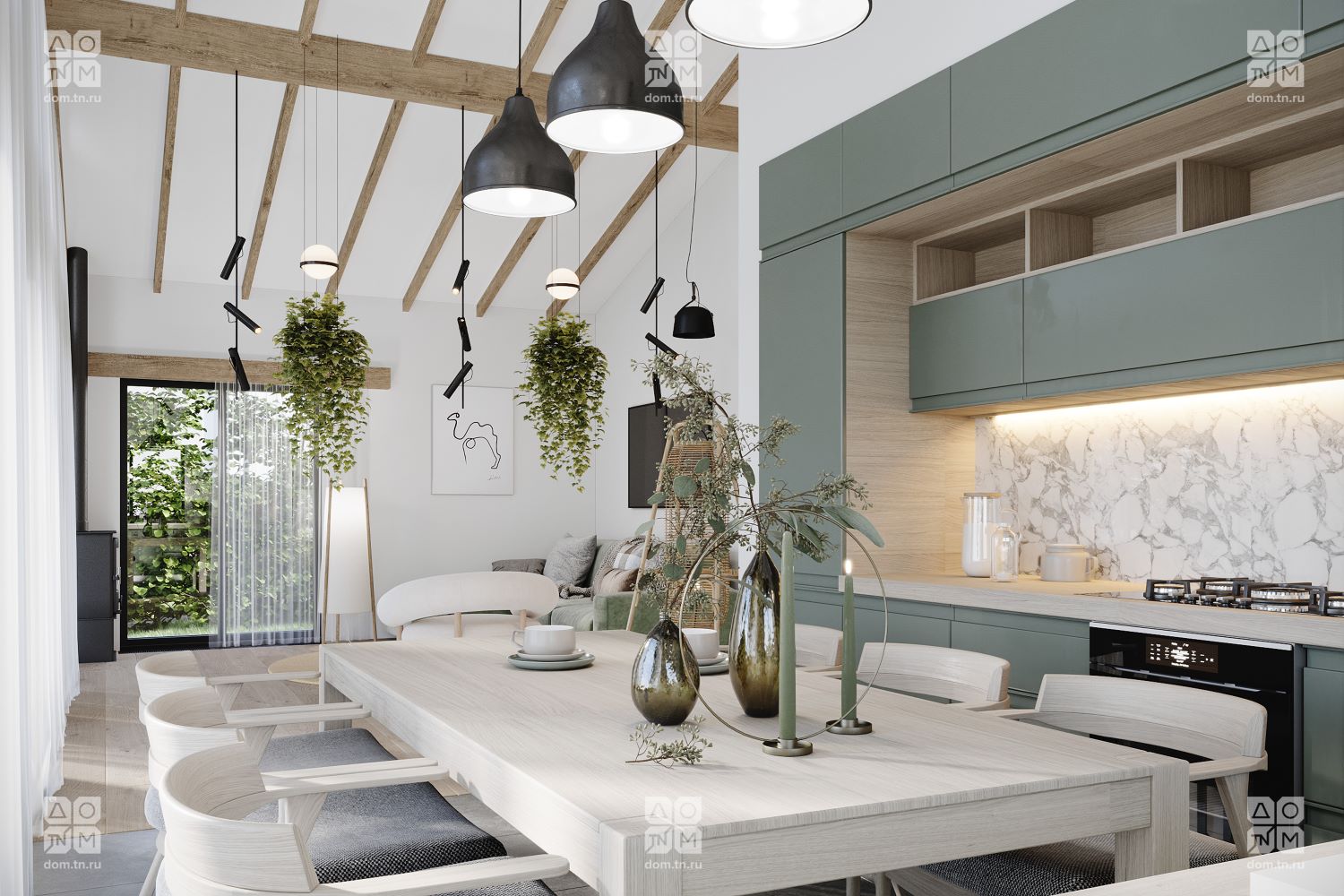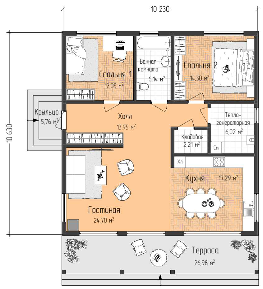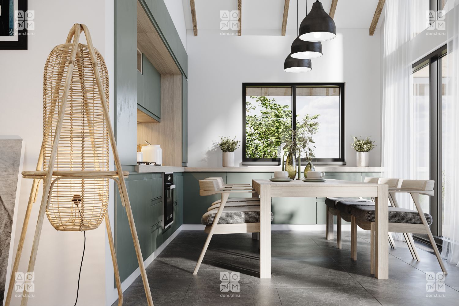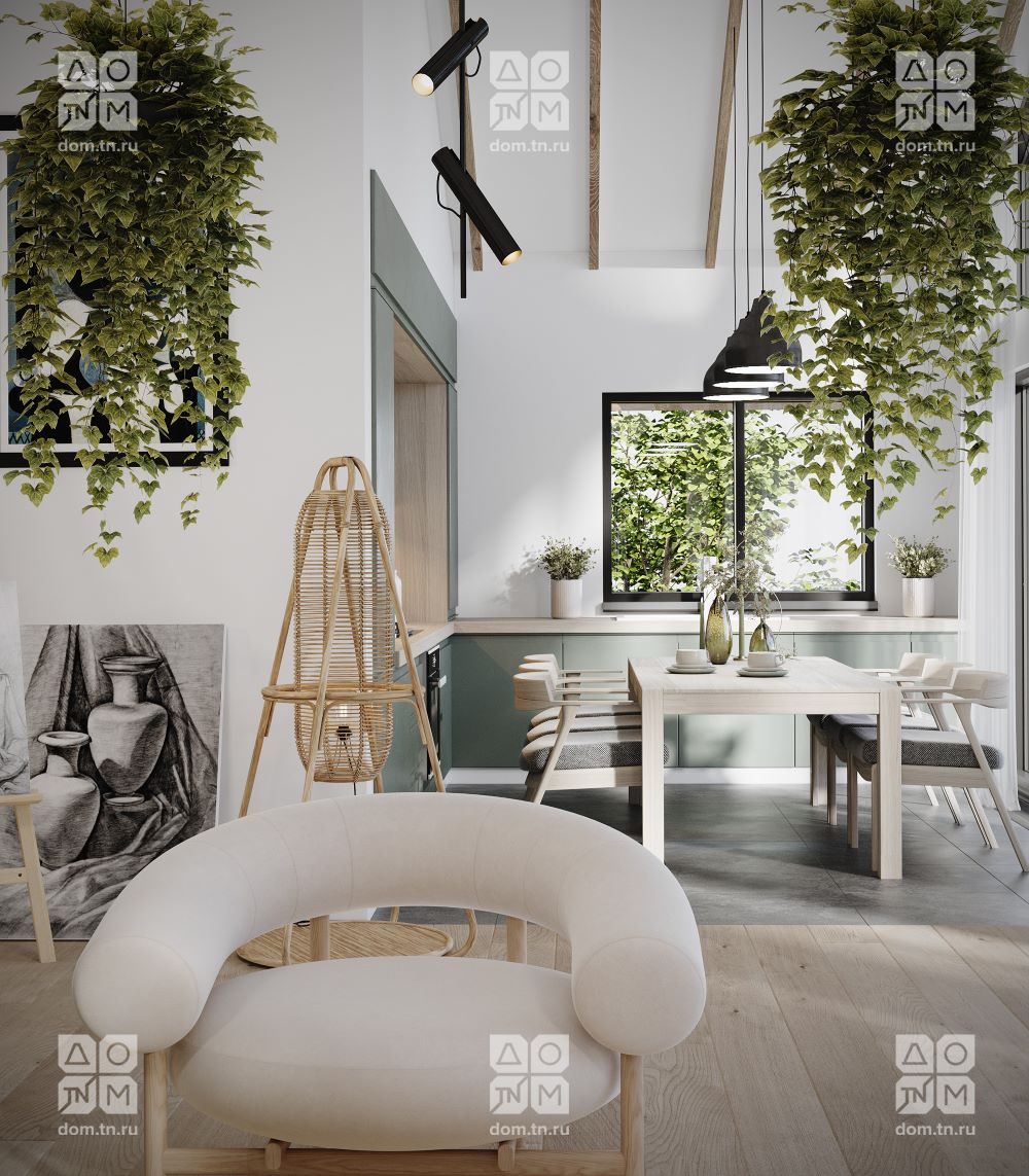 Терраса с навесом, открытая с трех сторон, практически удваивает площадь гостиной. Здесь свободно размещается обеденная группа и мягкая зона отдыха. В теплое время года терраса становится полноценным местом для жизни – для игр с детьми, приема гостей, наблюдения за восходом и закатом, задушевных бесед и наслаждения пением птиц.