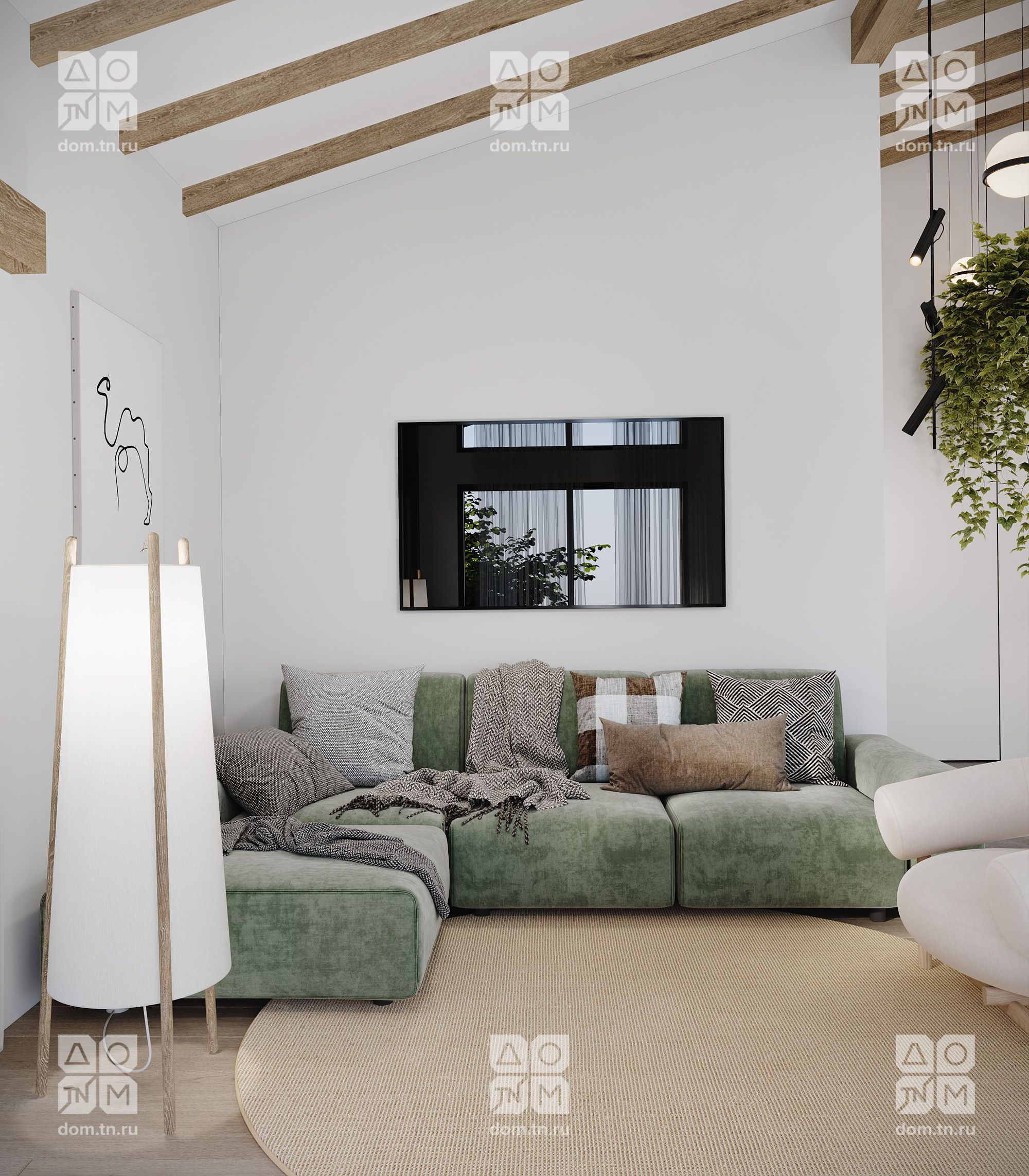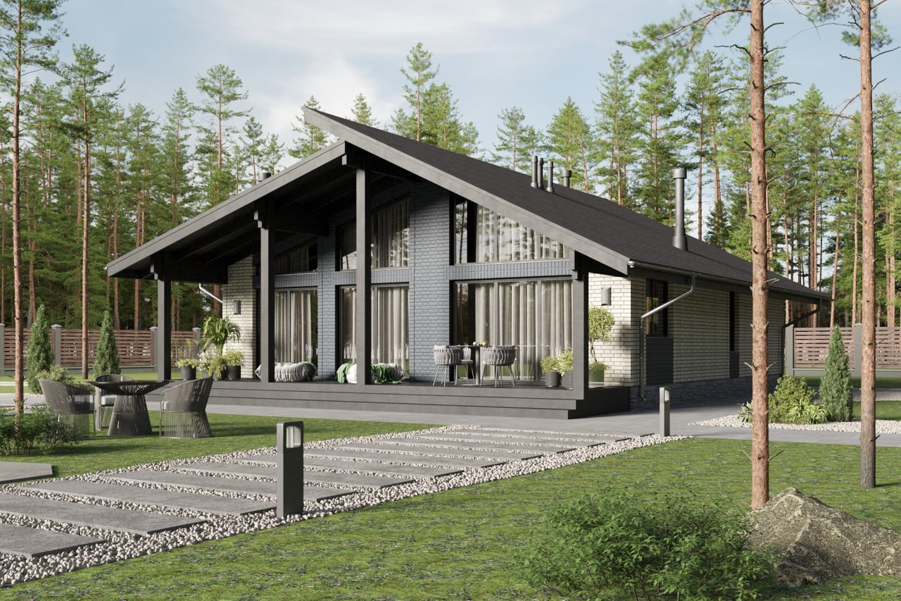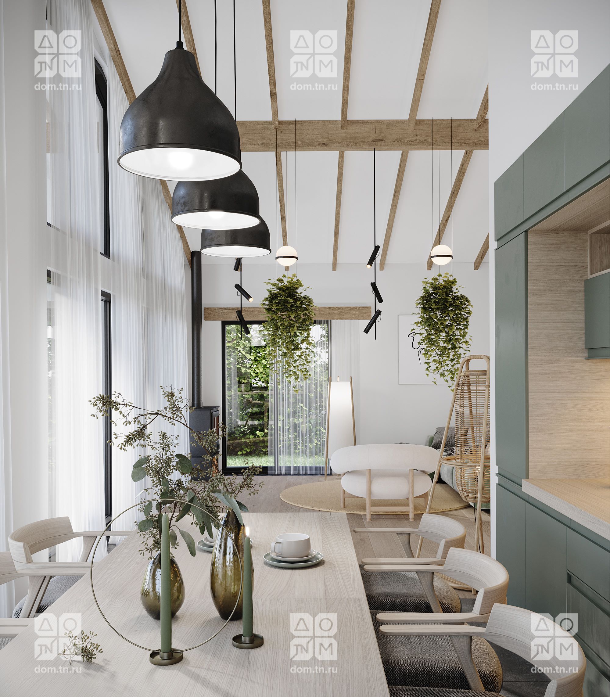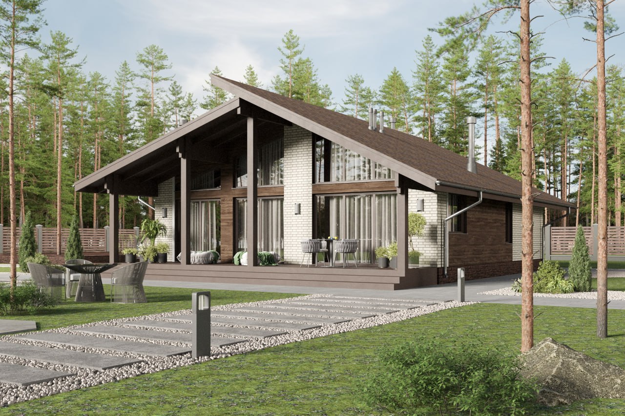Терраса с навесом, открытая с трех сторон, практически удваивает площадь гостиной. Здесь свободно размещается обеденная группа и мягкая зона отдыха. В теплое время года терраса становится полноценным местом для жизни – для игр с детьми, приема гостей, наблюдения за восходом и закатом, задушевных бесед и наслаждения пением птиц.