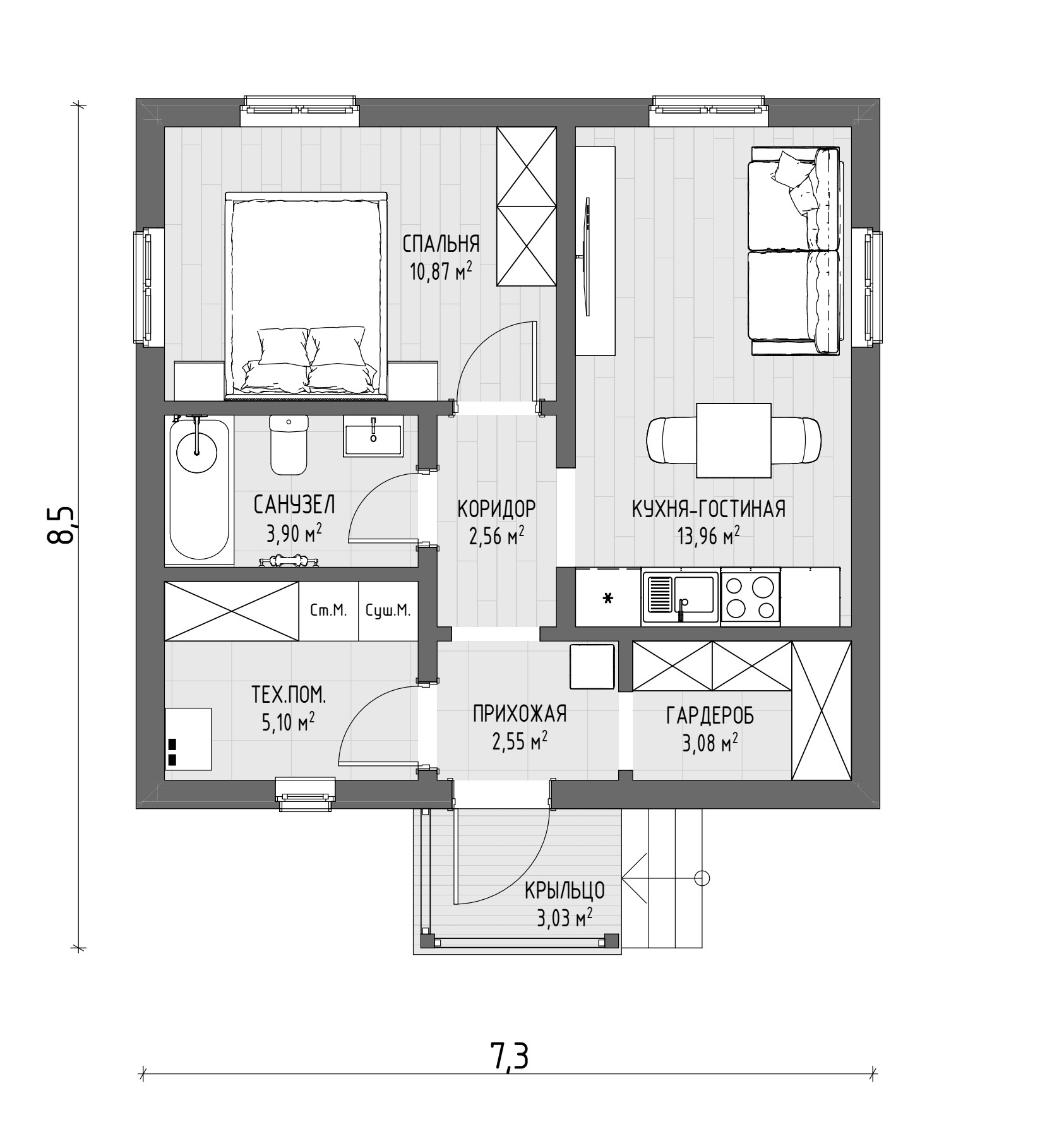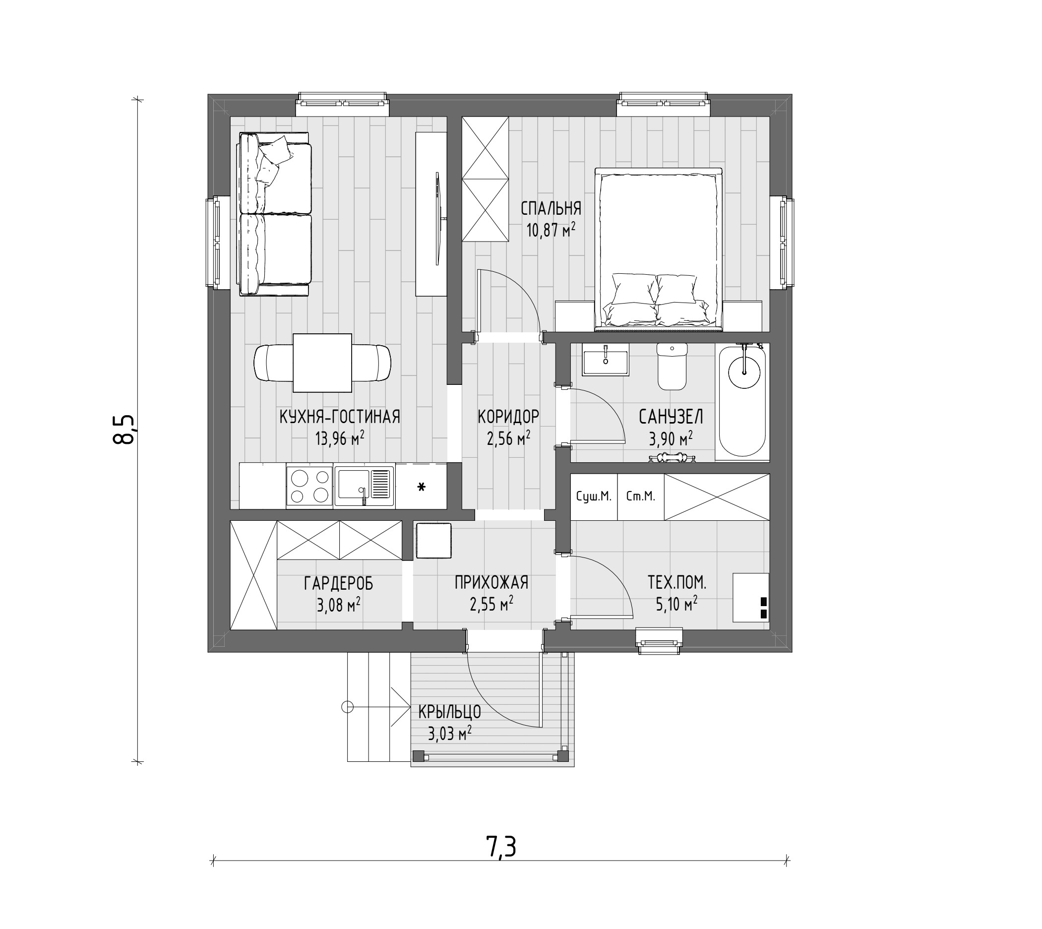 Этот компактный коттедж – идеальное решение для тех, кто ценит функциональность и уют в сочетании с экономичностью. Продуманная планировка позволяет максимально эффективно использовать каждый квадратный метр, создавая комфортное пространство для жизни и отдыха. Большие окна наполняют дом естественным светом, визуально расширяя пространство и создавая ощущение простора.